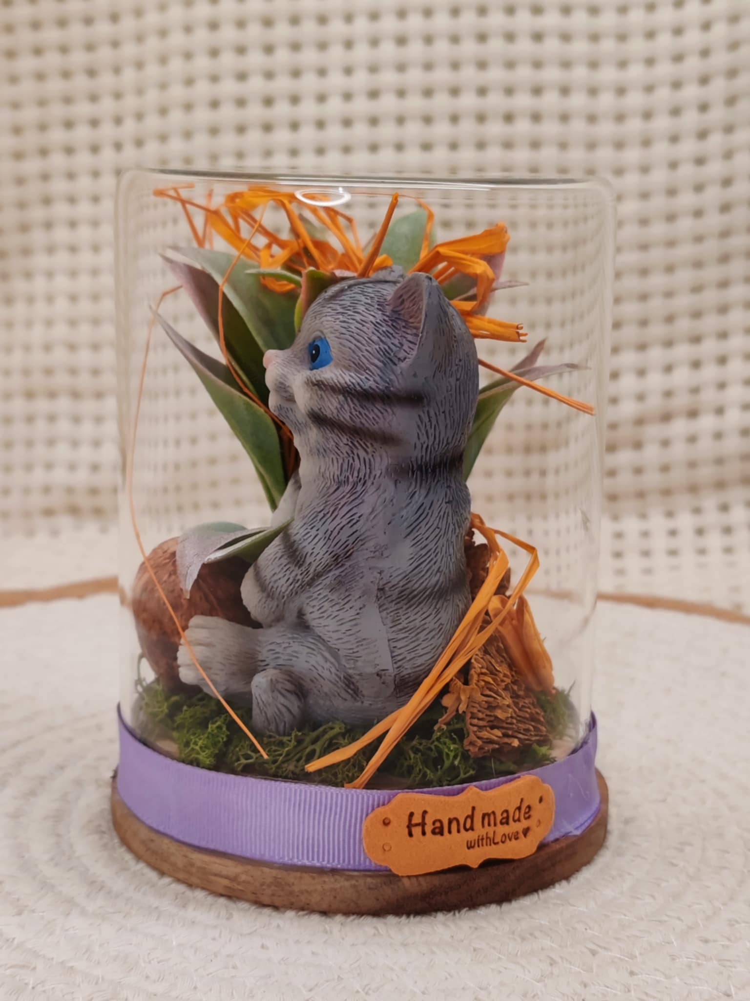 Entièrement réalisée à la main, cette adorable cloche en verre renferme un petit Chat tout en délicatesse, minutieusement modelé et décoré avec soin.