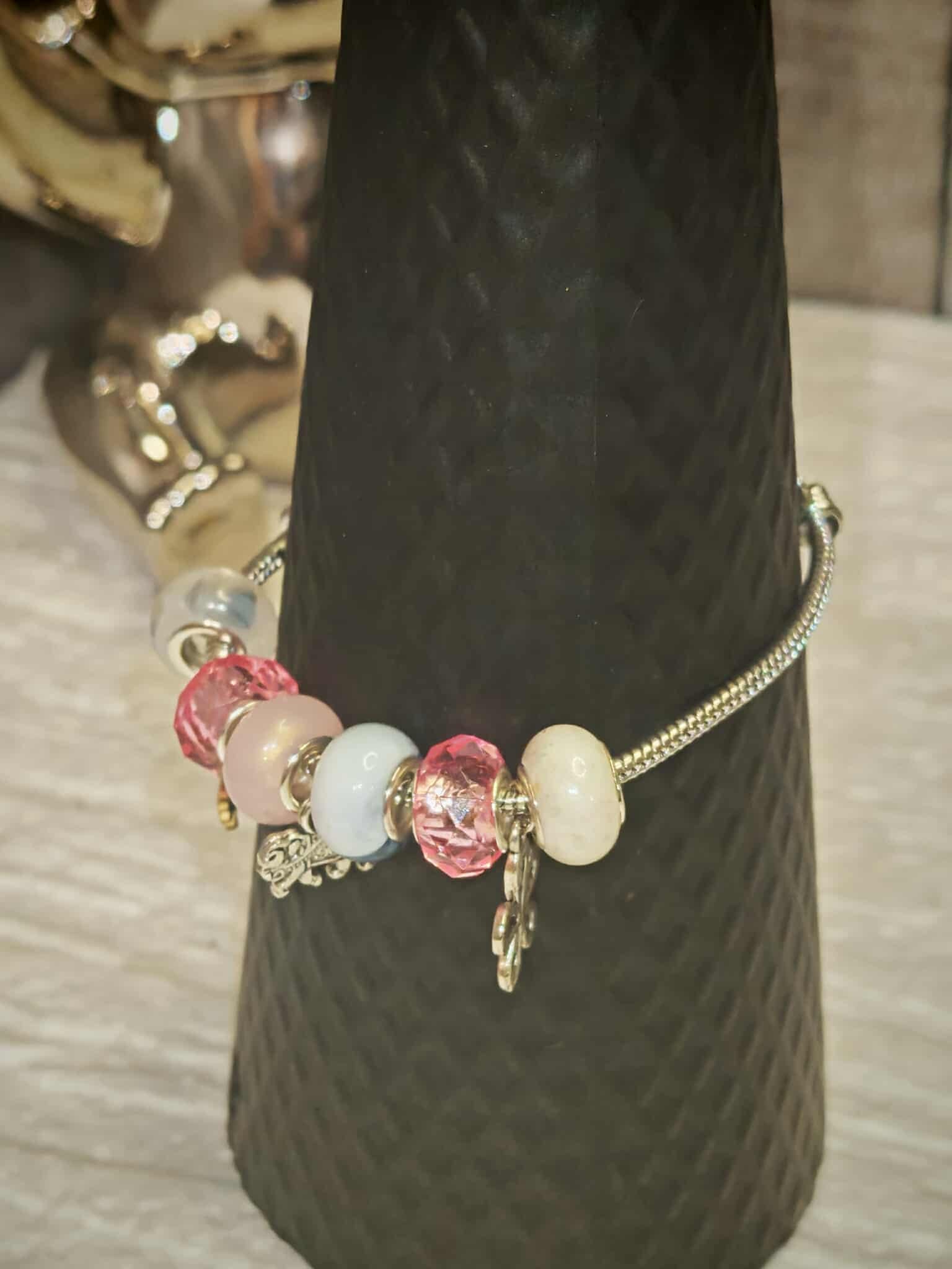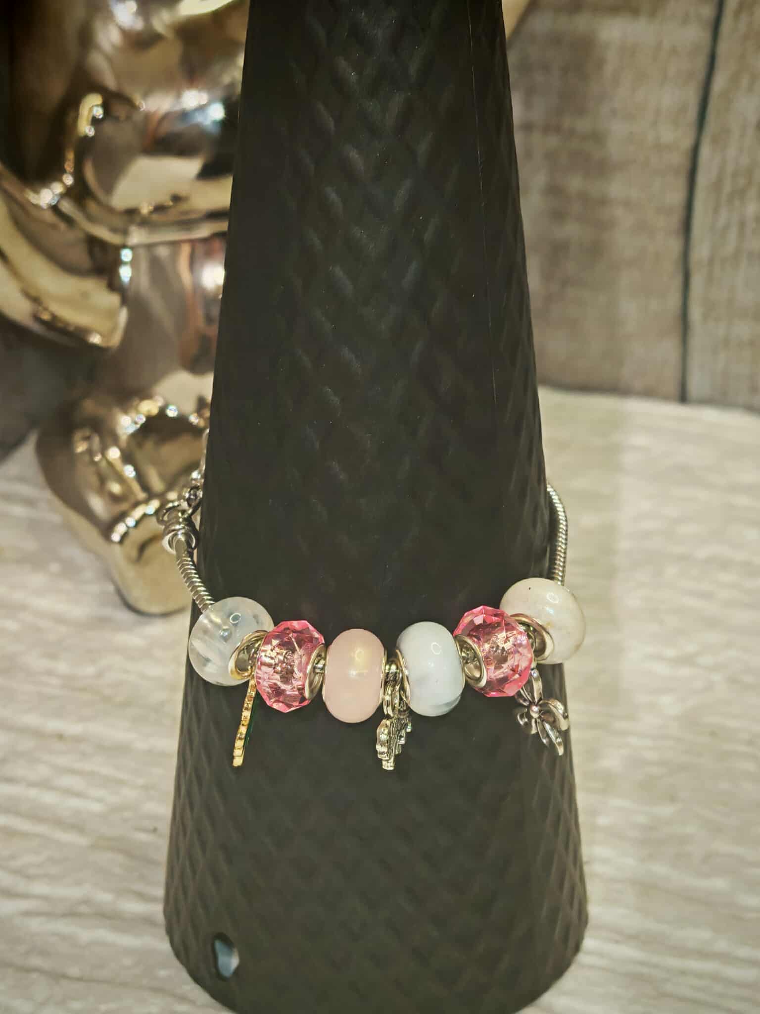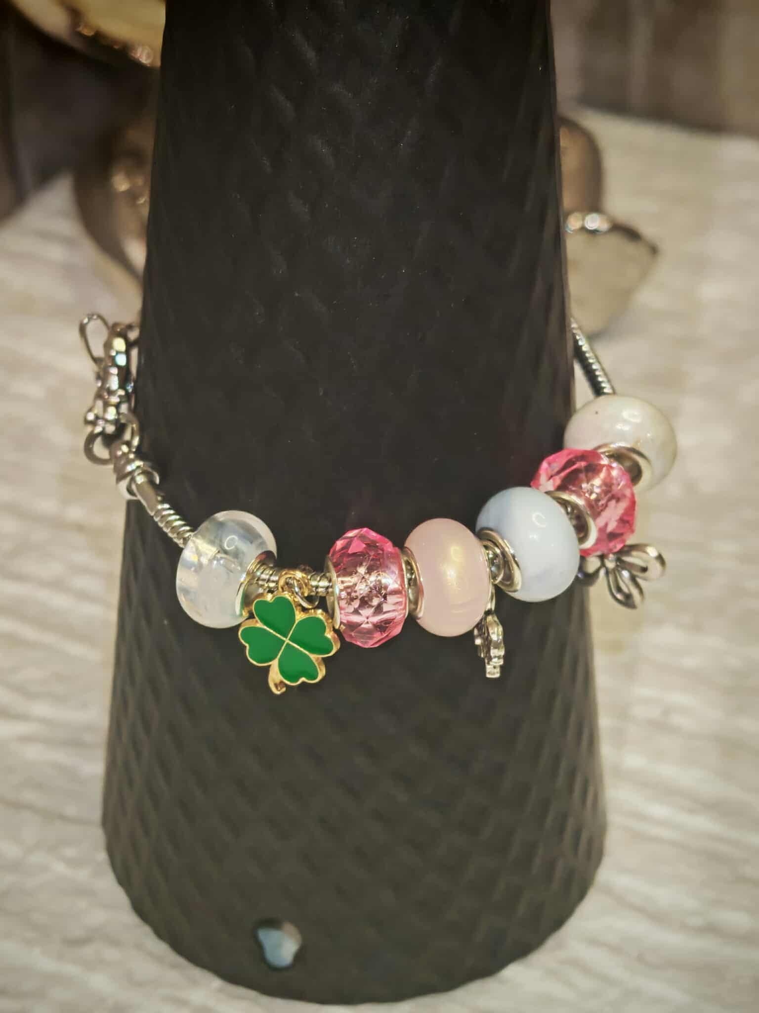 ✨ Bracelet Charms Élégant – Perles Roses & Blanches + Breloques Chance ✨