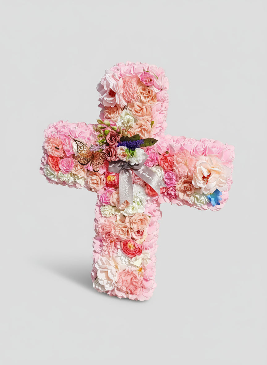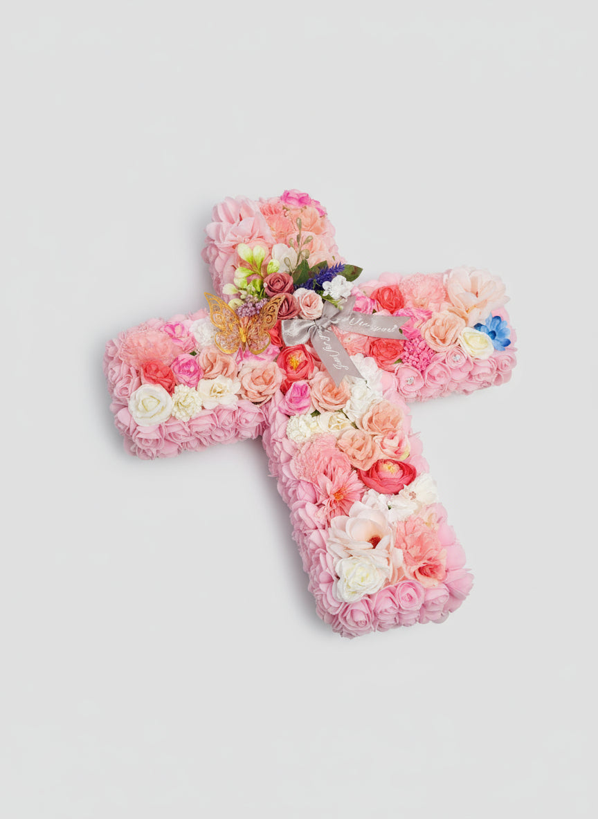 Rendez un dernier hommage tout en douceur avec cette croix funéraire faite entièrement à la main, ornée de roses en mousse artificielle soigneusement disposées.
