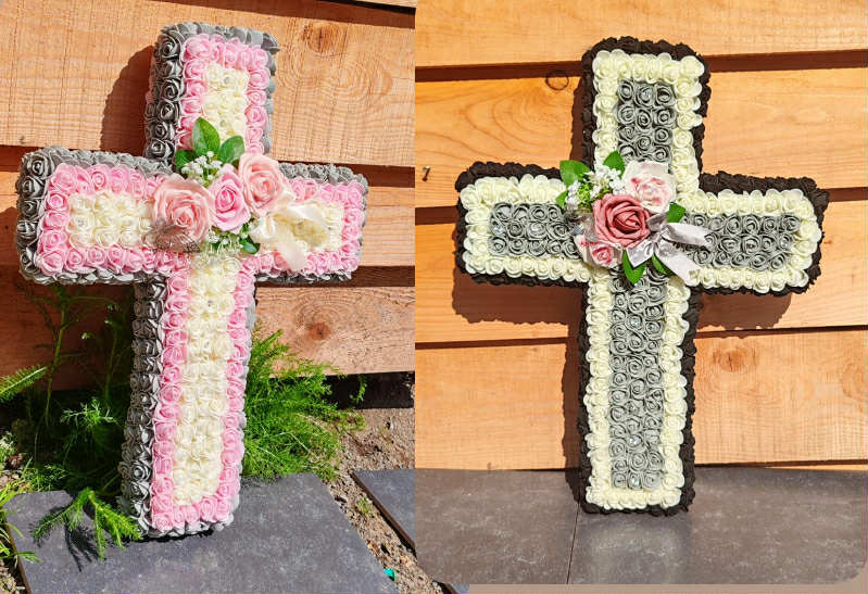 Rendez un dernier hommage tout en douceur avec cette croix funéraire faite entièrement à la main, ornée de roses en mousse artificielle soigneusement disposées.