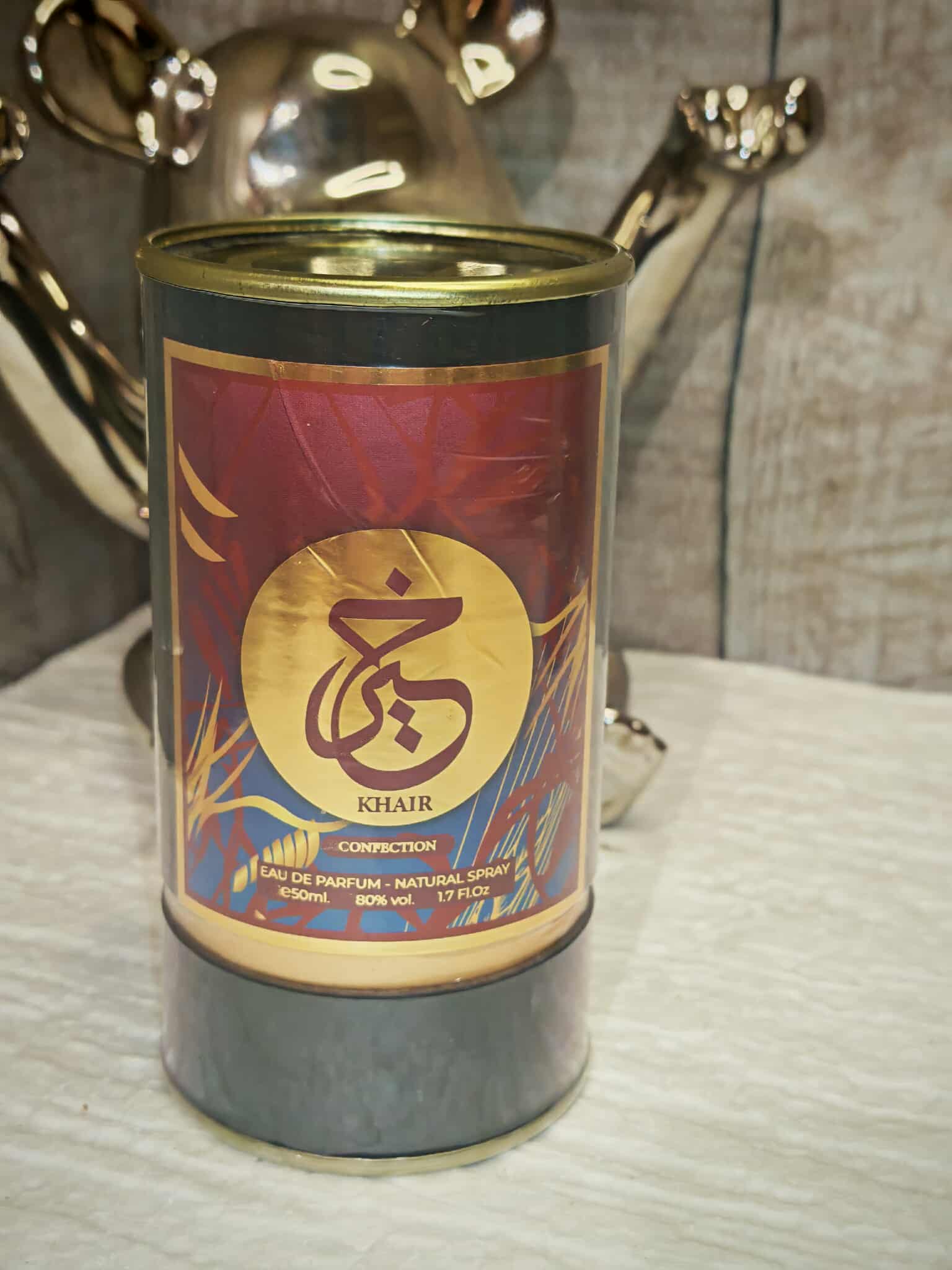 Khair Confection – Eau de Parfum 50 ml Fragrance Gourmande & Orientale Laissez-vous séduire par Khair Confection, une Eau de Parfum sophistiquée qui marie à la perfection délicatesse sucrée et profondeur orientale. Son packaging cylindrique bordeaux et or évoque immédiatement le luxe, la chaleur et le mystère des parfums du Moyen-Orient. ---
